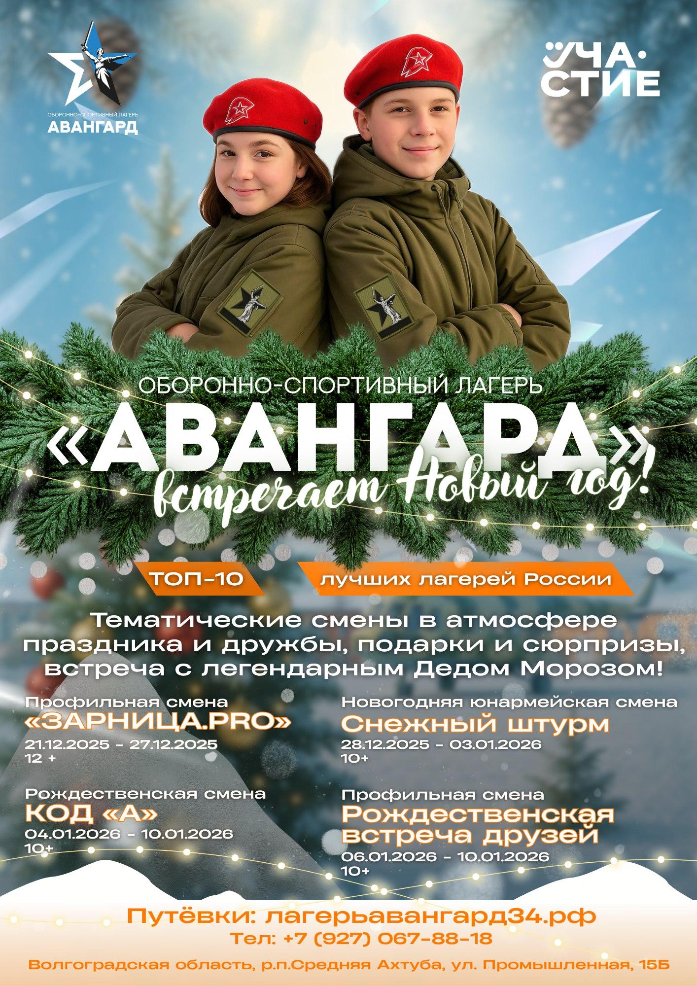 Уникальный оборонно-спортивный лагерь «Авангард», Волгоградская региональная молодежная добровольческая общественная организация «Участие» приглашают школьников Волгоградской области и других регионов страны к участию в зимних сменах – это отличный полезный подарок ребенку в преддверии новогодних праздников и зимних каникул.